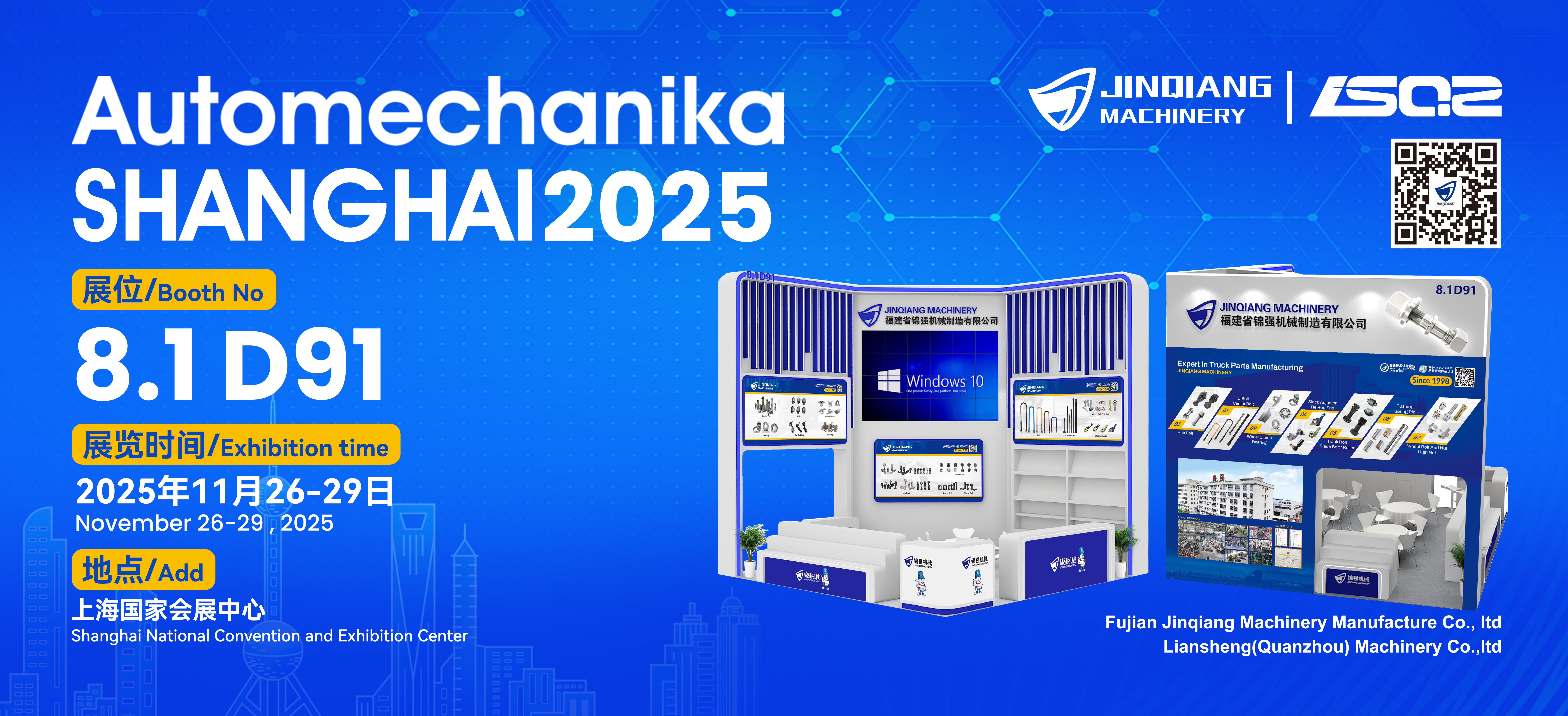 Taron masana'antar kera motoci na shekara-shekara da ake tsammani a duniya -Automechanika Shanghai 2025 - zai gudana daga ranar 26 zuwa 29 ga Nuwamba, 2025, a Cibiyar Baje kolin Kasa da Kasa (Shanghai). A matsayin na musamman maufacturer a kasuwanci abin hawa fasting da kuma watsa aka gyara, Jinqiang Machinery Manufacturing Co., Ltd. ya tabbatar da sa hannu. Kamfanin zai nuna cikakken kewayon samfuran manyan ayyuka a Booth 8.1D91 a cikin Hall 8.1, yana nuna mahimman abubuwan haɗin gwiwa kamar nau'ikan kusoshi, U-bolts, bearings, da fil fil.