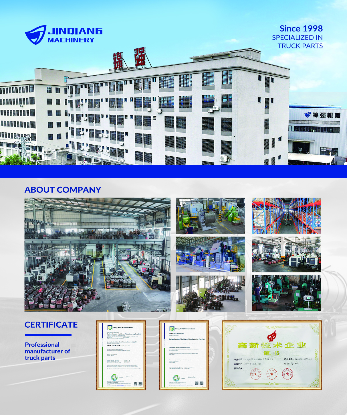 Jinqiang Machinery Manufacturing Co., Ltd. ƙware a samar da high-ƙarfi fasteners da kuma m aka gyara ga nauyi- wajibi manyan motoci, Trailers, da kuma gine-gine inji. Sanye take da ci-gaba samar da wuraren samar, wani m ingancin management system, da kuma robust R&D damar, kamfanin fitar da kayayyakin zuwa da yawa kasashe da yankuna a duk duniya, mashahuri a cikin masana'antu don abin dogara inganci da na kwarai sabis.